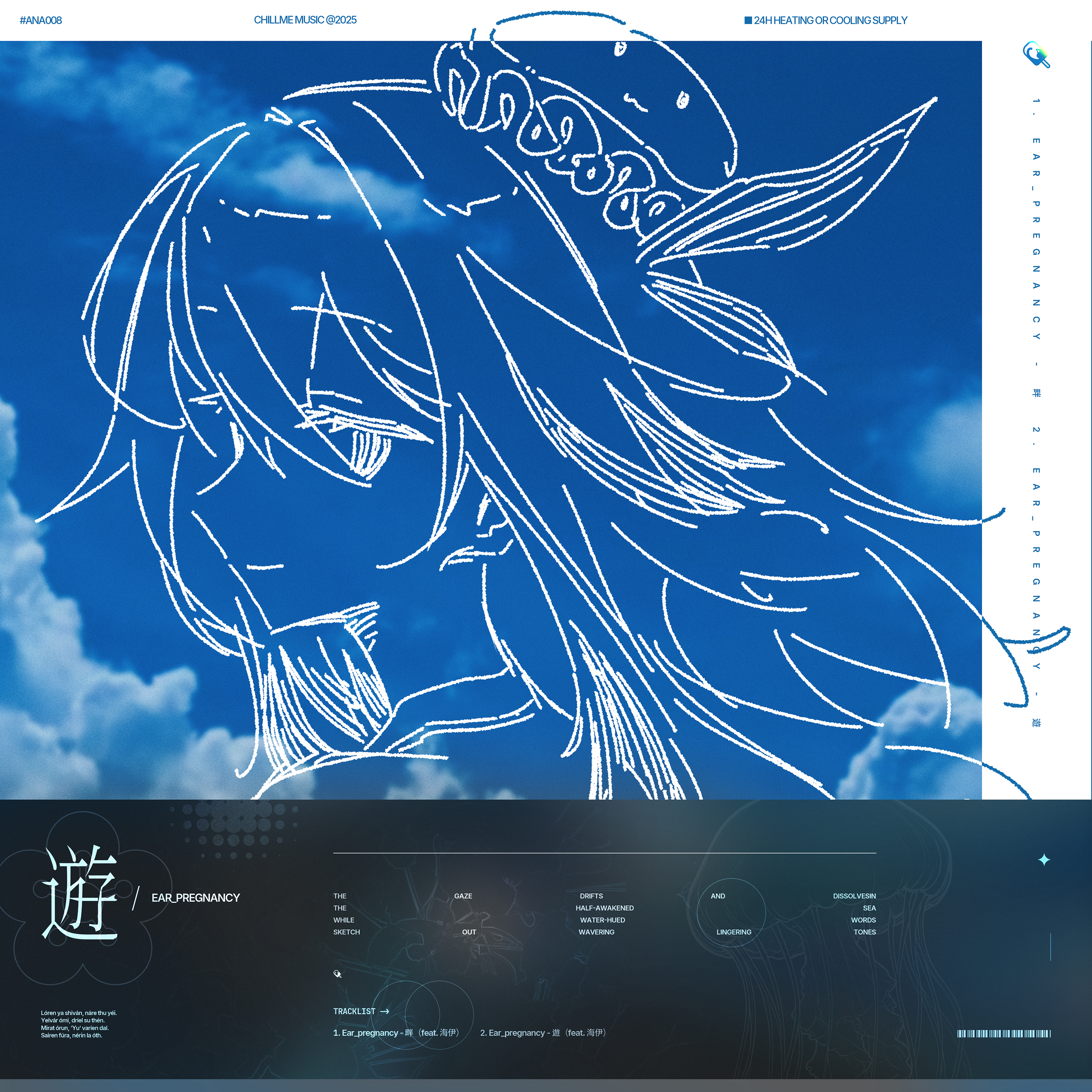 遊 「Sinking and floating sight dissolves in the half-awake sea, Aqua-hued words tremble lightly, tracing sustained notes.」 Tracklist: 1. Ear_Pregnancy - 畔 (feat. 海伊) 2. Ear_Pregnancy - 遊 (feat. 海伊) Mastering: Ear_Pregnancy, SoilFo_yuan Design: GBXIN Illustrate: 古稀三