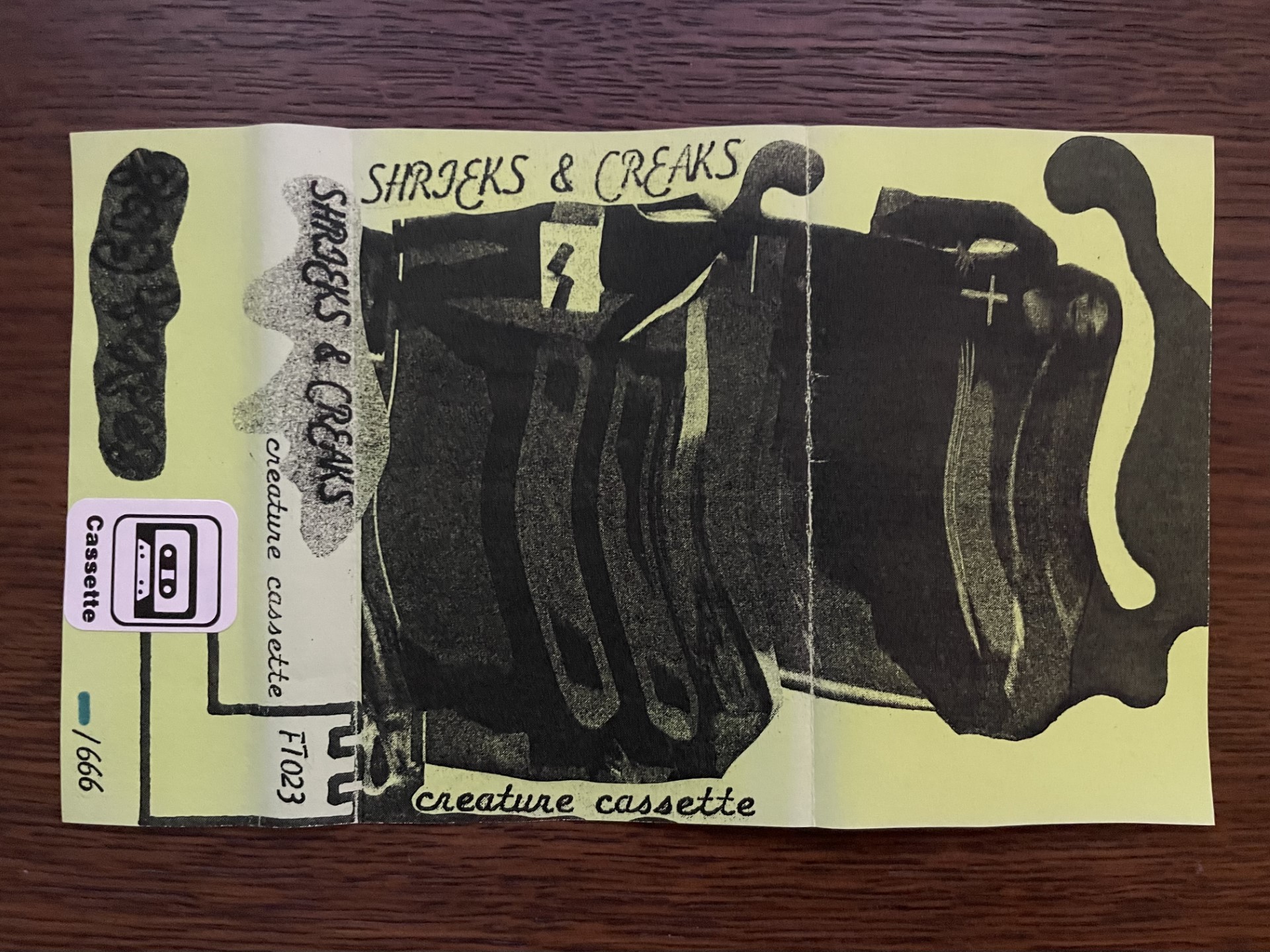FT023 SHRIEKS & CREAKS "Creature Cassette" cassette. A talking game. Board game bootleg. Gather your friends & family, drop acid, pop this tape in and roll the dice! Originally released in 1988. "Go to the basement". Includes sticker. Hand painted. Hand numbered edition /666.